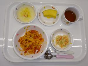 • 給食ナポリタン、キャベツと人参のサラダ、さつま芋スープ、バナナ