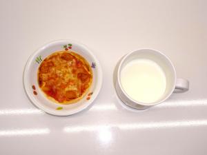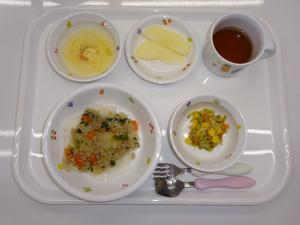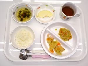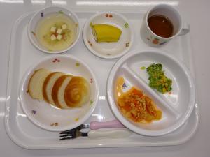 • 給食ロールパン、鶏肉と野菜のトマト煮、ブロッコリーサラダ、豆腐と茸のスープ、バナナ