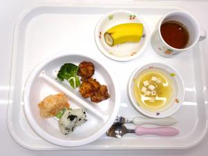 • 給食おにぎり(鮭&わかめ)、鶏の唐揚げ、ブロッコリー、味噌汁(わかめ)、バナナ