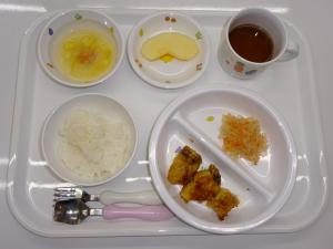 • 給食ご飯、かじきのBBQソース、大根の塩昆布和え、味噌汁、りんご
