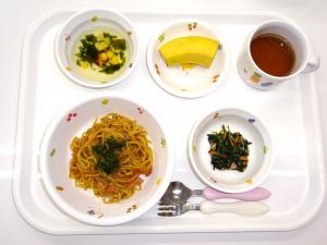 • 給食焼きそば、ひじきとほうれん草のサラダ、わかめとコーンのスープ、バナナ