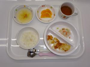 • 給食ご飯、カレイのチーズパン粉焼き、大根とツナの和え物、味噌汁、オレンジ