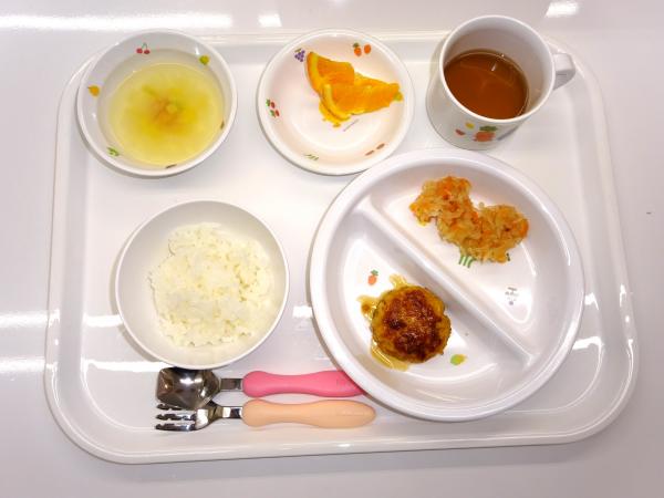 • 給食ご飯、鶏つくね(豆腐)、大根のおかか和え、味噌汁、オレンジ