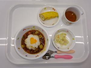 • 給食ハヤシライス、キャベツとツナのサラダ、バナナ