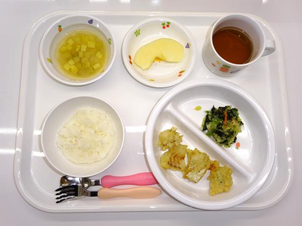 • 給食ご飯、鱈の磯部揚げ、ほうれん草の磯和え、味噌汁、りんご