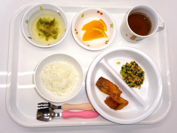 • 給食ご飯、赤魚のムニエル、白菜の納豆和え、味噌汁、オレンジ