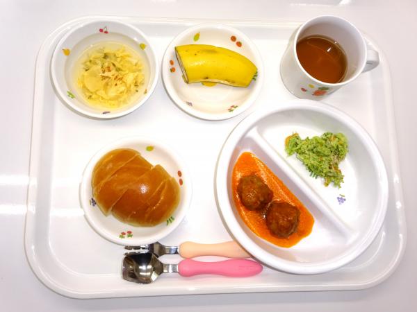 • 給食ロールパン、ミートボール、ブロッコリーとツナのサラダ、玉子スープ、バナナ