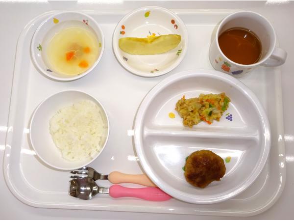 • 給食ご飯、和風ハンバーグ、白菜の納豆和え、味噌汁、りんご