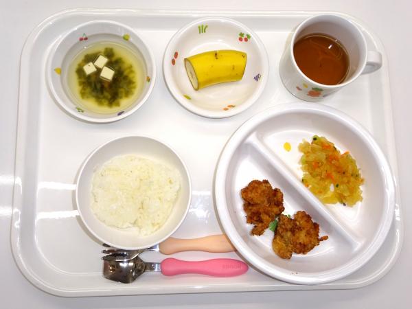 • 給食ご飯、鶏のから揚げ、大根のサラダ、味噌汁、バナナ