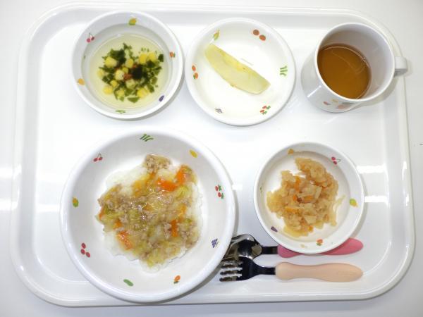 • 給食中華丼、大根とツナの和え物、ワカメとコーンのスープ、りんご
