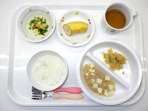 • 給食ご飯、麻婆豆腐、キャベツのナムル、わかめスープ、バナナ