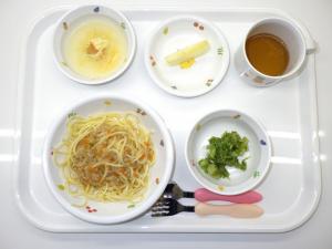 • 給食肉みそスパゲッティー、ブロッコリーのおかか和え、卵スープ、りんご