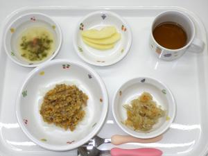 • 給食ご飯、かじきの照り焼き、ほうれん草の磯和え、味噌汁、りんご