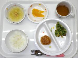 • 給食ご飯、鶏つくね(豆腐)、ブロッコリーのおかか和え、味噌汁、オレンジ