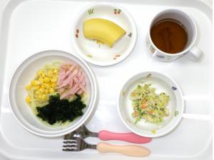 • 給食ラーメン、キャベツとツナのサラダ、バナナ