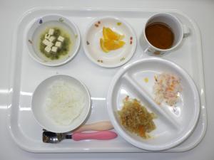 • 給食ご飯、鮭の照り焼き、白菜の納豆和え、味噌汁、オレンジ