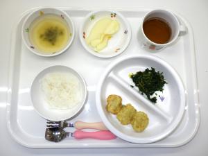 • 給食ご飯、豆腐の落とし揚げ、ほうれん草の胡麻和え、味噌汁、りんご