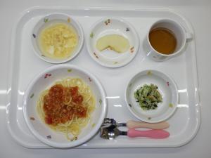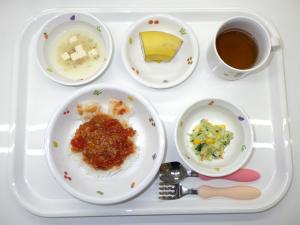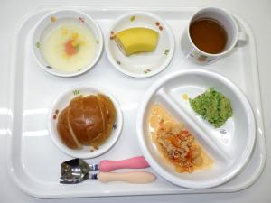 • 給食ロールパン、鶏肉と野菜のトマト煮、ブロッコリーのサラダ、コーンスープ、バナナ